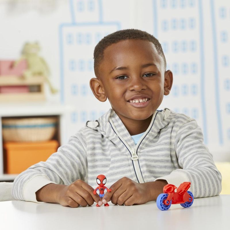Este kit inspirado no show Spidey and His Amazing Friends vem com figura e moto para as crianças criarem aventuras incríveis! A figura de 6 cm encaixa na moto para que as crianças possam recriar cenas do show. Ótimo presente de festas ou aniversário para meninos e meninas a partir dos 3