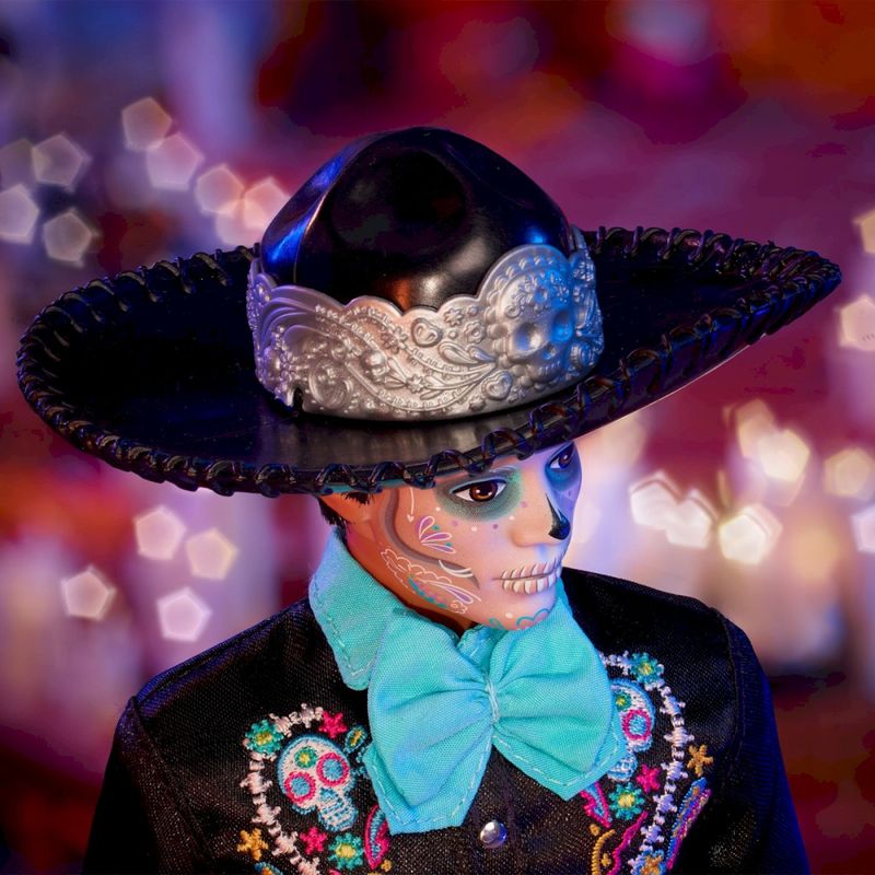 Boneca Ken - Dia de Muertos Fabricante: Mattel. Coleção: Barbie Signature O boneco Ken está impressionante em um terno preto acetinado com detalhes em turquesa e bordados. Ele completa seu visual com pintura facial calavera, um cinto prateado e um sombrero de aba larga. Embora vendidos separadamente, os bonecos Barbie e Ken usam padrões complementares, tornando-os um conjunto perfeito e a lembrança definitiva que inspira alegria e elegância. - Inclui Boneco e certificado de autenticidade