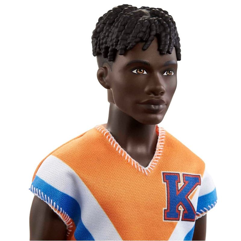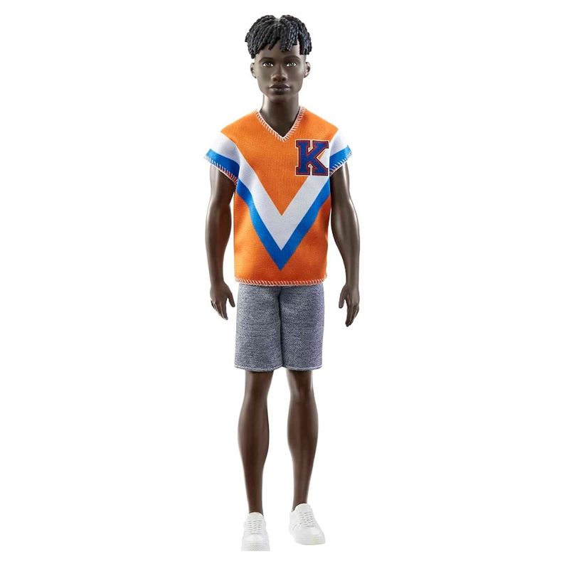 Boneco Ken tem uma forma de corpo original e cabelos pretos ele usa uma camisa esportiva com um gráfico chevron, combinada com um confortável short cinza.