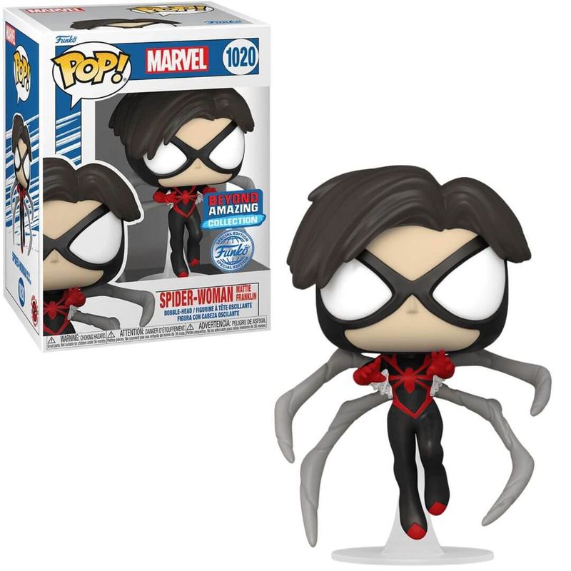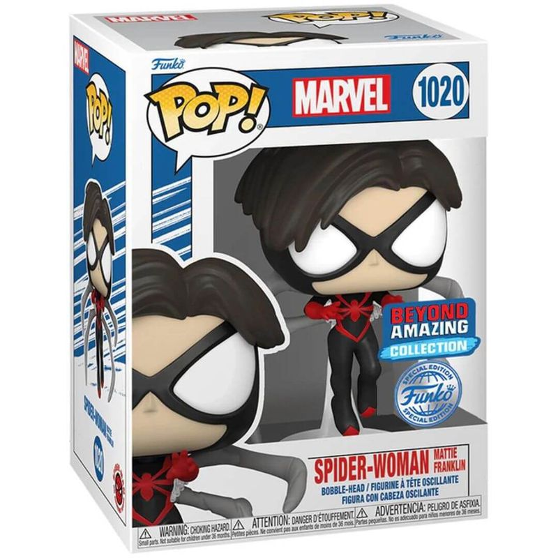 Boneco Colecionável Funko Pop da Mulher Aranha (Mattie Franklin) da Marvel Comics. Produzido em vinil de alta qualidade, a figura da Spider Woman de Mattie Franklin tem 9,5 cm de altura, produzido no estilo Pop, que conquistou o coração e as estantes de todos os amantes de filmes, séries, animes, quadrinhos e muito mais.