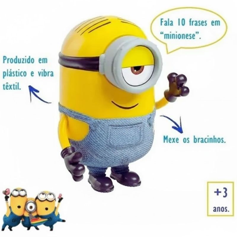 Ele mede aproximadamente 24,5 cm e ao apertar sua barriga ele fala 10 frases em minionese, a língua dos Minions!