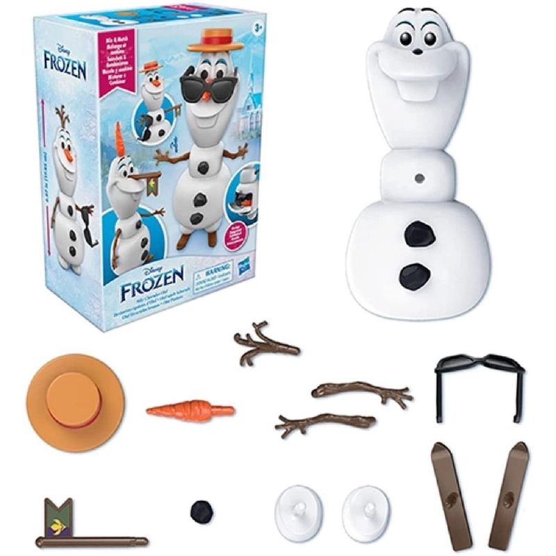 Este conjunto de brinquedos Frozen vem com Olaf, um chapéu, óculos de sol, bandeira, 2 braços de pau, cabelo de pau, nariz de cenoura, 2 esquis, 2 pés e um botão de carvão.
