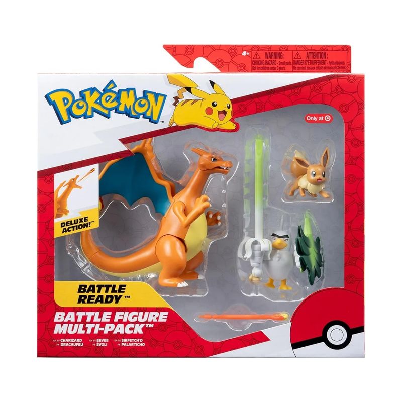 Conjunto com três figuras Pokémon em diferentes tamanhos e tipos: Eevee (2"), Sirfetch’d (3") e Charizard (4,5") — representando os tipos Normal, Lutador e Fogo. As figuras apresentam acabamento fiel ao visual da série animada Pokémon, com detalhes autênticos que destacam expressões, posturas e efeitos de batalha, como o disparo de míssil de fogo do Charizard.