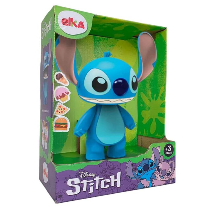 Boneco Stitch com 24 cm de altura, que abre a boca para comer as comidinhas. Além disso, as orelhas e braços são articulados. Com ele a brincadeira de faz de conta fica mais divertida e ajuda a criança a desenvolver habilidades como a criatividade, empatia e competências sociais.