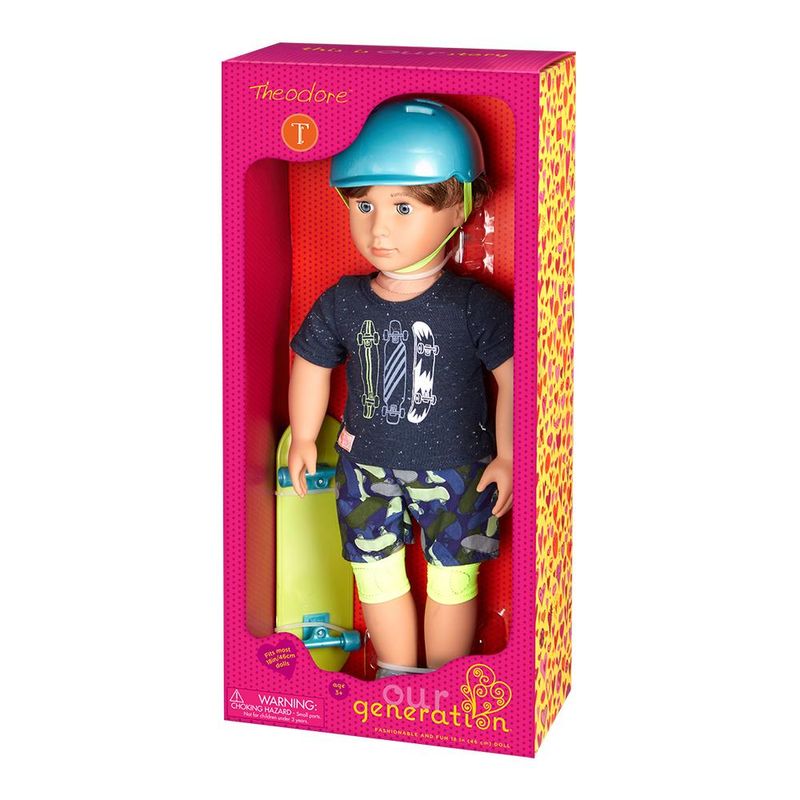Visite a pista de skate e faça manobras legais com o boneco Theodore de 46cm de Our Generation! Ele tem cabelo castanho curto com olhos azuis e veste camiseta estampada de skate com shorts combinando e um par de tênis de corrida. Ele também tem um par de joelheiras coloridas e um capacete para mantê-lo seguro em todas as aventuras esportivas! Our Generation não se trata apenas de uma boneca, um lindo conjunto de roupas ou mesmo um kit de acessórios fantásticos. É sobre incentivar crianças de todos os estilos e gostos a criar suas próprias histórias, desenvolvendo um universo ilimitado de brincadeiras com bonecas e acessórios. Sua embalagem é feita de material reciclado, especialmente desenvolvida para uma geração mais ecológica que não aceitaria nada menos. Essa é a nossa história, e essa é a nossa turma!