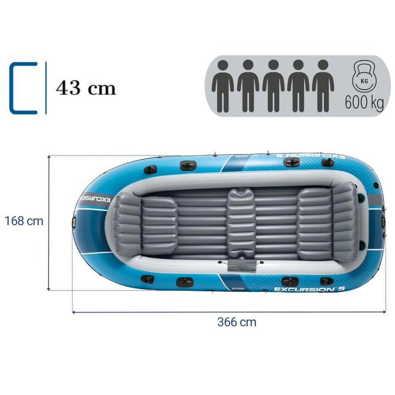 Bote inflável Excursion 5 para 4 ou 5 pessoas, com capacidade para 600kg. Suporta motor de até 1.5 Hp. Fabricado em vinil Super- Touch que garante maior resistência e durabilidade, excelente para ser usado em praias, lagos, represas e rios. Acompanha bomba de ar manual e par de remos para seu uso. É de fácil transporte e pode ser guardado no porta mala do seu carro quando não esta inflado. Possui 3 câmaras de ar e vem com bolsa interna para guardar objetos, conta com 3 assentos infláveis removíveis para maior conforto.