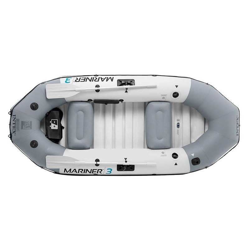 O Bote Inflável Mariner 3 Intex é um bote profissional que aceita motorização de até 3hp, instalado com suporte (vendido separadamente). Possui quilha central, suporte para remos giratórios (já incluídos) e assentos removíveis. O Piso do Bote Mariner é de PVC rígido, revestido de vinil formando um estrado para pisar sem danificar o bote. Este barco foi projetado para 3 pessoas de até 100kg cada, acomodando-se com segurança. É um excelente produto para se usar em lagoas, mares, rios e represas. De fácil transporte, pode ser levado no porta-malas do carro.