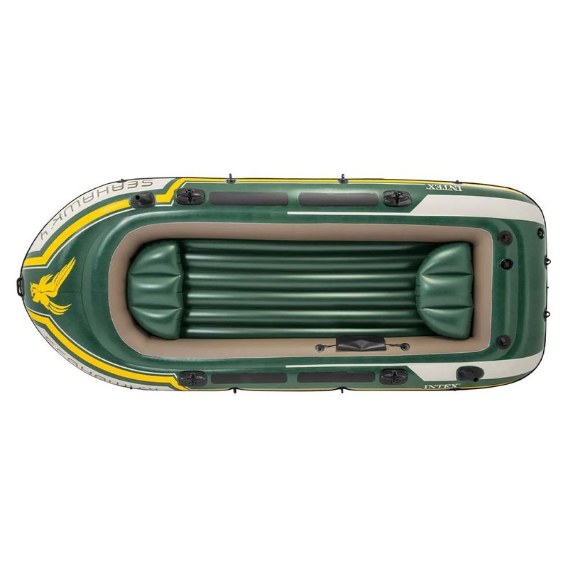 Bote inflável seahawk para 4 ou 5 pessoas, com capacidade para 400kg.Fabricado em vinil Super- Touch que garante maior resistência e durabilidade, excelente para se usar em praias, lagos, represas e rios.Acompanha bomba de ar manual e par de remos para seu uso.É de fácil transporte e pode ser guardado no porta mala do seu carro quando nao esta inflado.Possui 3 camaras de ar e uma bolsa para guardar objetos,e ainda conta com uma corda de segurança para evitar quedas do bote.
