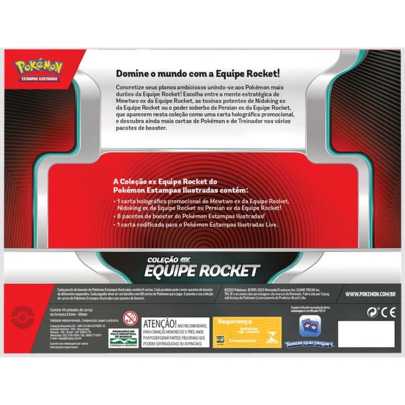 Escolha entre a mente estratégica de Mewtwo ex da Equipe Rocket, as toxinas potentes de Nidoking ex da Equipe Rocket ou o poder soberbo de Persian ex da Equipe Rocket, que aparecem nesta coleção como uma carta holográfica promocional, e descubra ainda mais cartas de Pokémon e de Treinador nos vários pacotes de booster.