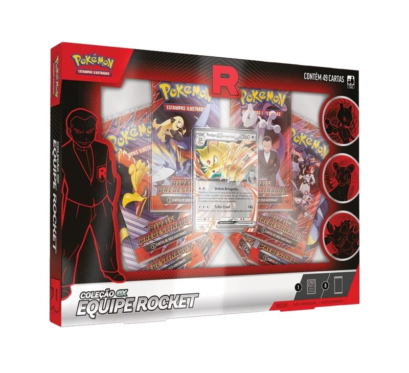 Box Coleção Ex Equipe Rocket - Persian Domine o mundo com a Equipe Rocket! Concretize seus planos ambiciosos unindo-se aos Pokémon mais durões da Equipe Rocket! Escolha o poder soberbo de Persian ex da Equipe Rocket, que aparece nesta coleção como uma carta holográfica promocional, e descubra ainda mais cartas de Pokémon e de Treinador nos vários pacotes de booster. Contém 49 unidades de cartas no formato 63mm x 88mm Diversão garantida para colecionadores e jogadores! Produto original, em português, com certificação de segurança INMETRO.