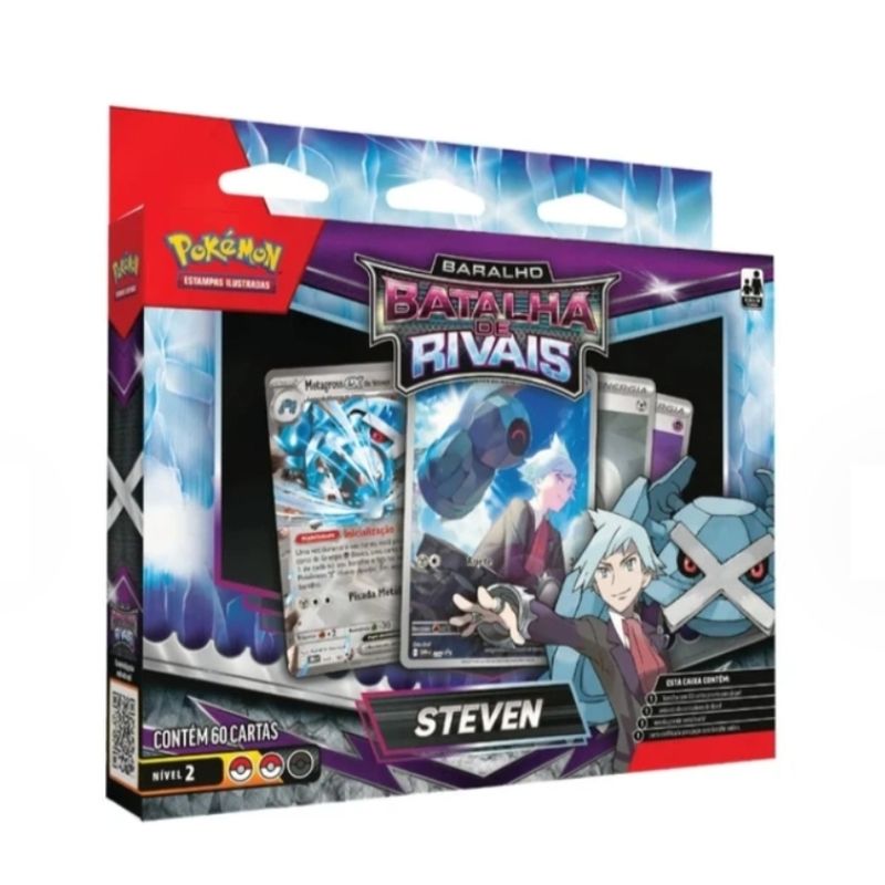 O Deck de Batalha Steven Rival é focado no personagem Steven Stone, junto com seus Pokémon parceiros Beldum e Metagross EX. Os dois principais destaques do deck são o Beldum de Steven e o Metagross ex de Steven.1 Baralho de 60 cartas pré-definidas;1 Conjunto de contadores de dano de papel-cartão;1 Moeda metalizada;1 Carta codificada para jogar Pokémon Estampas Ilustradas Live.Tamanho das cartas do jogo:60 cartas de tamanho PADRÃO (63,5X88mm).