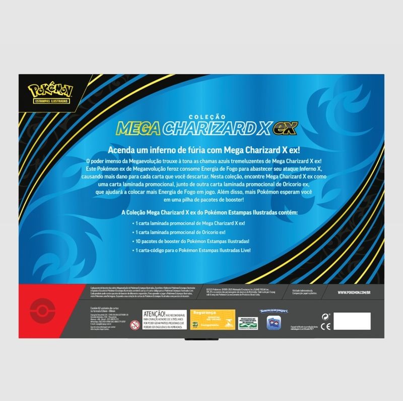 Conteúdo da caixa:1 carta laminada promocional de Mega Charizard X EX1 carta laminada promocional de Oricorio EX10 boosters de Pokémon Estampas Ilustradas1 carta-código para Pokémon Estampas Ilustradas Live
