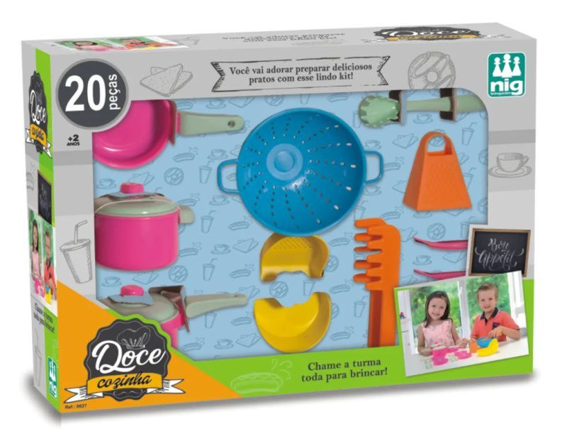 O conjunto doce cozinha da NIG brinquedos contém 20 peças coloridas e divertidas.Contém panelas, talheres, utensílios como ralador, escorredor de arroz e muito mais. Um kit completo produzido em material resistente e atóxico