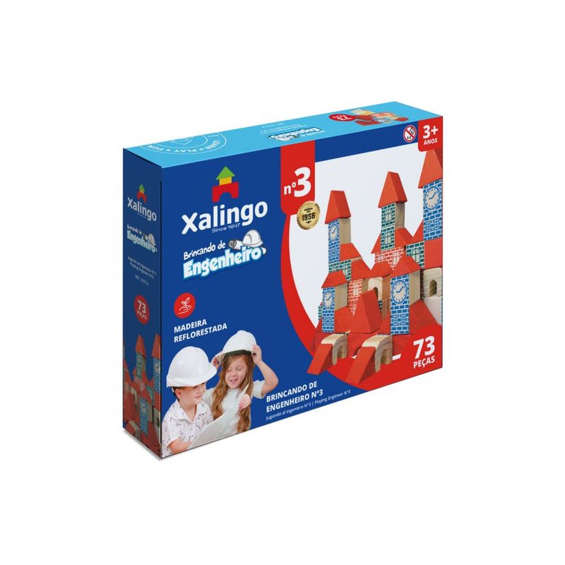 Brincando de Engenheiro com 73 peças! Desenvolve o pensamento lógico, a imaginação e a criatividade da criança. Fabricado em madeira reflorestada.