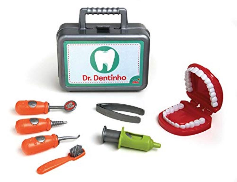 Dr. Dentinho e um kit com tudo que um bom dentista precisa ter. Vem com espelho para ver aquela carie bem la no fundo, pinca para arrancar o dente, injecao para aplicar anestesia, motorzinho para tratar daquele dente dificil, escova de dente, explorador e ate uma boquinha para usar todas essas ferramentas! Tudo isso guardados em uma maleta pratica que ajuda a crianca a levar a brincadeira para onde quiser!