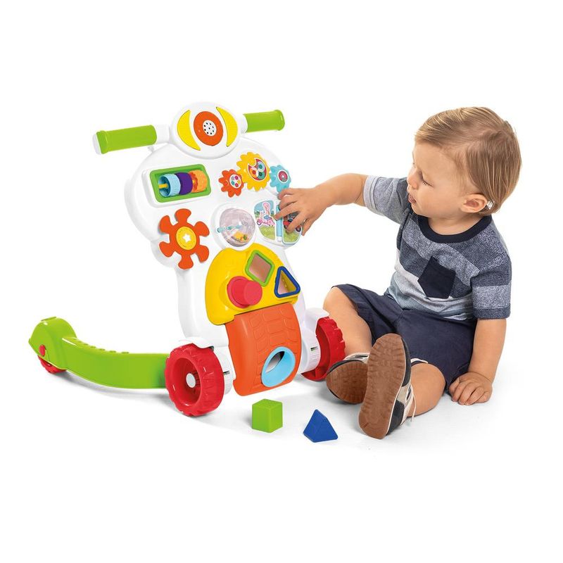 Com som especial de motoca! Brinquedo 2 em 1 com design inspirado em uma motocicleta. É um andador e um centro de atividades que encanta com seus detalhes. Os relevos lembram as garras de um pneu, as luzes que acendem ao acionar o som e simulam um farol. O painel didático possui diversas interações, como pecinha para girar com barulhinho de “creck-creck”, e peças de encaixar. Estimula a percepção auditiva e visual com luzes e sons divertidos. O andador foi desenvolvido pensando na segurança das crianças. Possui um sistema que trava as rodas dianteiras, caso o andador seja puxado para trás. Sua base ampla garante maior segurança e também transmite mais confiança, possibilitando um apoio firme para o bebê caminhar.