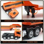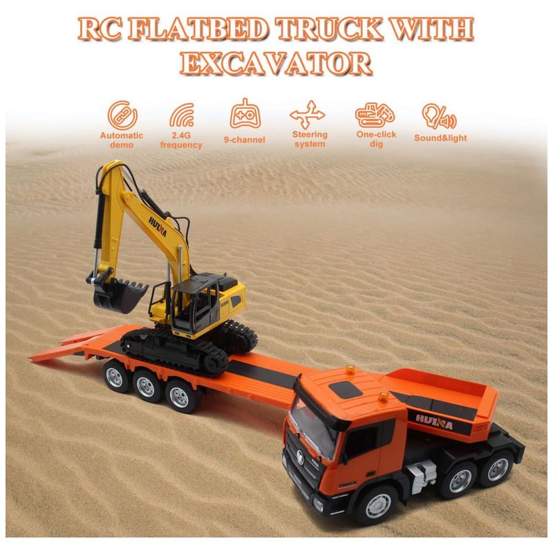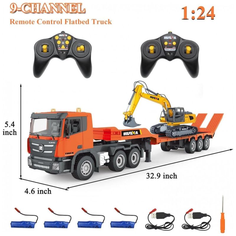 Comande este caminhão semi truck RC de forma realista, com funções avançadas de 9 canais. Além de avançar, retroceder, virar à esquerda/direita, ligar/desligar e funções de apresentação automática, você também controla a escavadeira remotamente. Com 68,58 centímetros de comprimento, este caminhão RC na escala 1:24 é capaz de rebocar vários tipos de veículos. Feito com materiais premium, resistente e seguro, este caminhão semi truck acompanha uma trailer destacável que se estende até 83,82 centímetros. Ideal para presentear crianças de 8 a 12 anos.