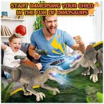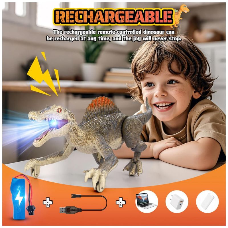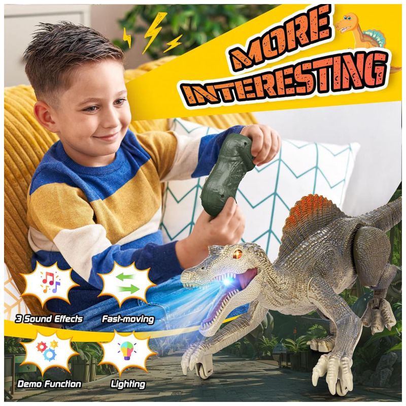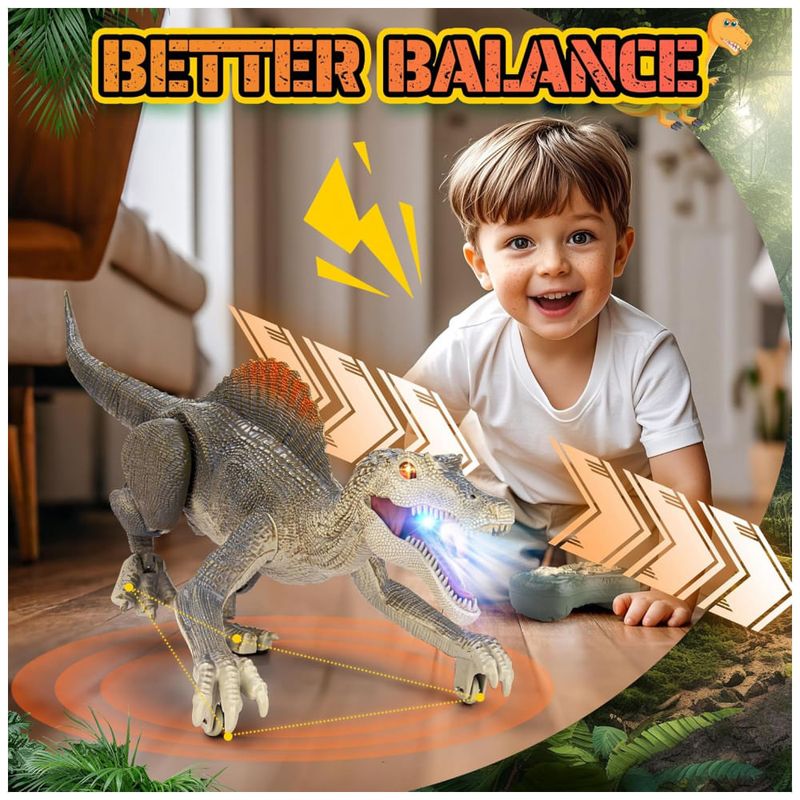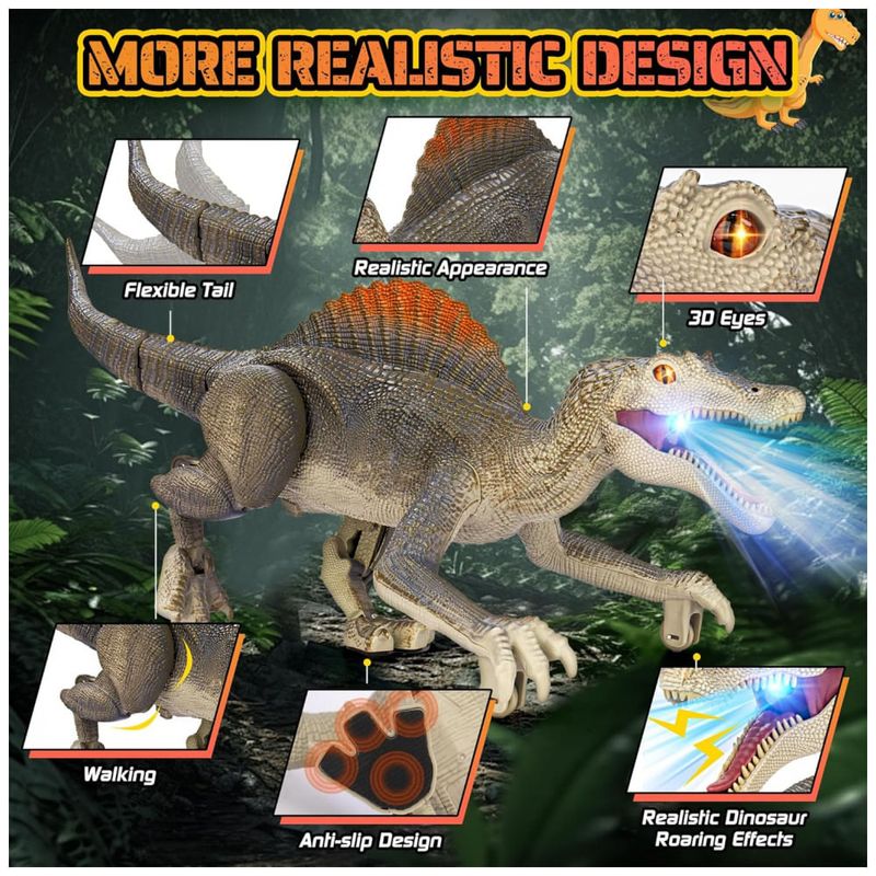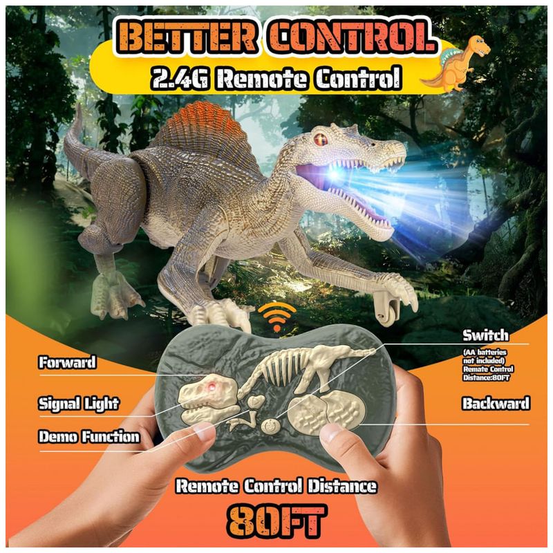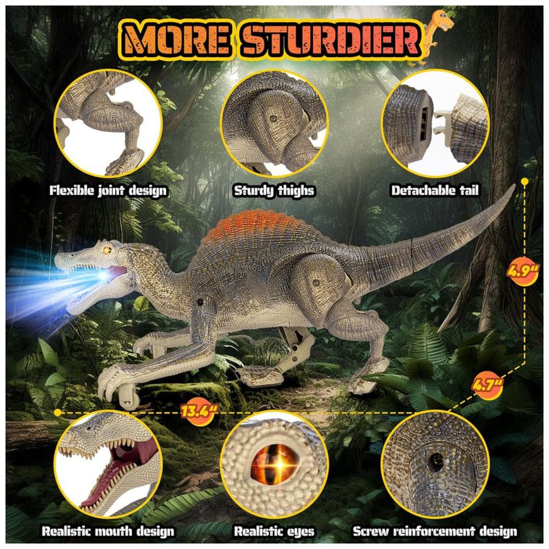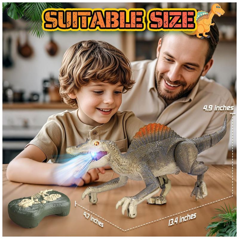 Rico em funções, mais diversão! Este brinquedo de dinossauro é repleto de funcionalidades e pode proporcionar muita diversão para as crianças. Possui efeitos realistas de rugidos de dinossauro, métodos realistas de caminhar e uma função de demonstração automática, cada um capaz de atrair profundamente as crianças. Ao andar, este dinossauro realista reproduzirá aleatoriamente três sons diferentes. Em festas, um dinossauro divertido deixará seus filhos cheios de alegria. Mais realista, imersivo! Este dinossauro de controle remoto tem um design mais realista. Você verá olhos 3D realistas, estilo de caminhar realista, design de aparência realista e cores de dinossauro realistas. Não apenas anda de forma realista, mas também tem bom equilíbrio e se move rápido. Quando as crianças começam a usar este brinquedo, parece que estão vendo criaturas pré-históricas reais. O design realista do dinossauro faz seu filho se sentir como se estivesse no período Jurássico. Recarregável! O brinquedo jurássico é equipado com uma bateria de lítio recarregável para ajudar a economizar pilhas AA. A bateria de lítio leva de 2 a 3 horas para carregar e dura 1 hora. Observe que o controle remoto requer duas pilhas AA que não estão incluídas. O dinossauro de controle remoto recarregável pode ser recarregado a qualquer momento, e a diversão nunca vai parar. Fácil de controlar! A distância do controle remoto pode chegar a 80 pés, a operação do controle remoto é simples e as teclas de função são concisas e claras. Nossos brinquedos jurássicos usam tecnologia de controle remoto 2.4G, que possui um sinal mais estável. Não há necessidade de se preocupar com o controle remoto perder o sinal. A conexão do controle remoto é mais estável e suporta vários dispositivos funcionando juntos no mesmo ambiente. Suporta controle inteligente de início e parada. Se o dinossauro não for controlado remotamente após cinco minutos, ele desligará automaticamente, o que pode ajudar a economizar energia. Mais resistente! O tamanho do produto é 34 x 12 x 12,5 centímetros. Feito de material ABS, os componentes do dinossauro são reforçados com parafusos, a estrutura é sólida e não se desmonta facilmente. O brinquedo de dinossauro para crianças de 3 anos precisa de um design mais sólido para que você possa deixar seus filhos brincarem com ele sem preocupações.
