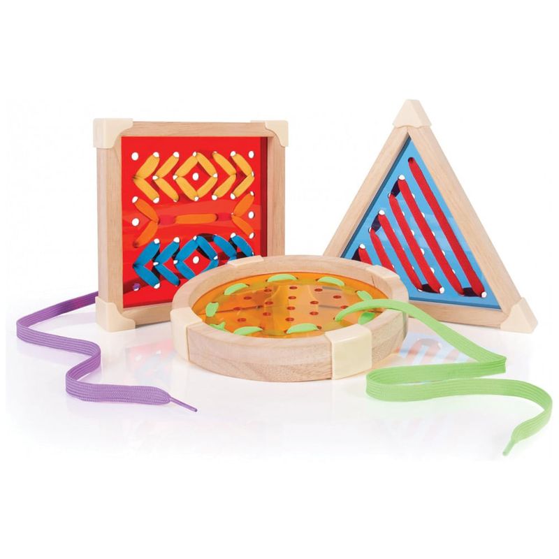 Itens inclusos: 3 placas geométricas (quadrado, triângulo, círculo), 6 cadarços coloridos
