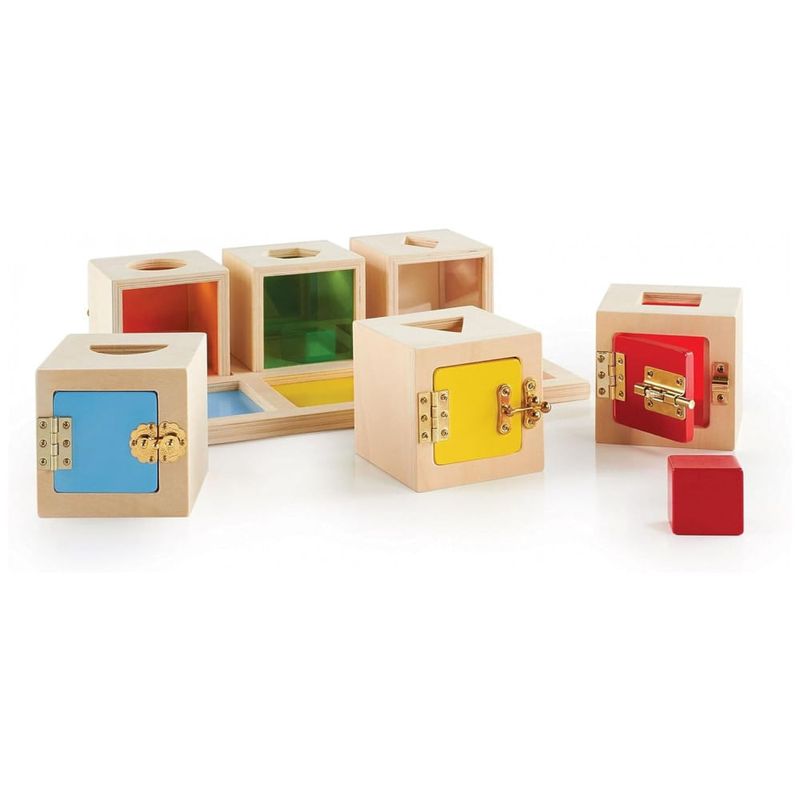 O Guidecraft Peekaboo Lock Boxes é um conjunto de seis caixas de madeira com fechaduras diferentes, desenvolvido para crianças a partir de 2 anos praticarem coordenação motora fina, solução de problemas e reconhecimento de formas. Cada caixa colorida possui um tipo de fecho único (trava, gancho, cadeado simples, entre outros), um recorte de forma geométrica na parte superior ou lateral e uma janela em acrílico colorido que permite visualizar o que está dentro.?
