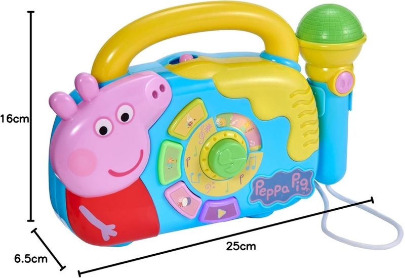 Caixa de Som Peppa Pig - Dance e divirta-se com a Caixa de Som Peppa Pig - Onde a Música Encontra a Aventura. Mergulhe seu filho nas melodias contagiantes da Peppa Pig. A caixa de som apresenta uma coleção de melodias e sons cativantes que farão seu filho dançar, cantar e curtir com seu amigo porco favorito. Incentive a expressão criativa quando seu filho estiver no palco com o microfone.