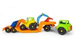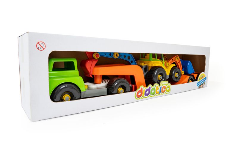 Esse brinquedo conta com uma carreta carregada com uma retroescavadeira, ambos os brinquedos têm alto valor didático porque contam com partes desmontáveis que instigam o desenvolvimento da concentração e a habilidade psicomotora das crianças.