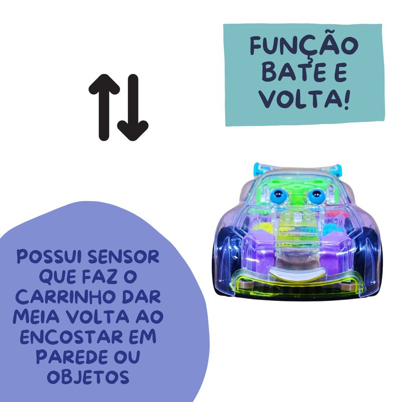 Carrinho feito de plástico transparente, com engrenagens coloridas, luzes de led e música! Estimula a curiosidade das crianças sobre o funcionamento das coisas, ajudando na sua capacidade cognitiva e de concentração; suas luzes coloridas de led deixam o carrinho ainda mais interessante, transformando em um verdadeiro espetáculo à noite; música divertida que deixa a brincadeira mais dinâmica; rodinha universal com função bate e volta, possui sensor que quando o carrinho encosta em paredes e objetos, ele dá meia volta, evitando ficar preso.