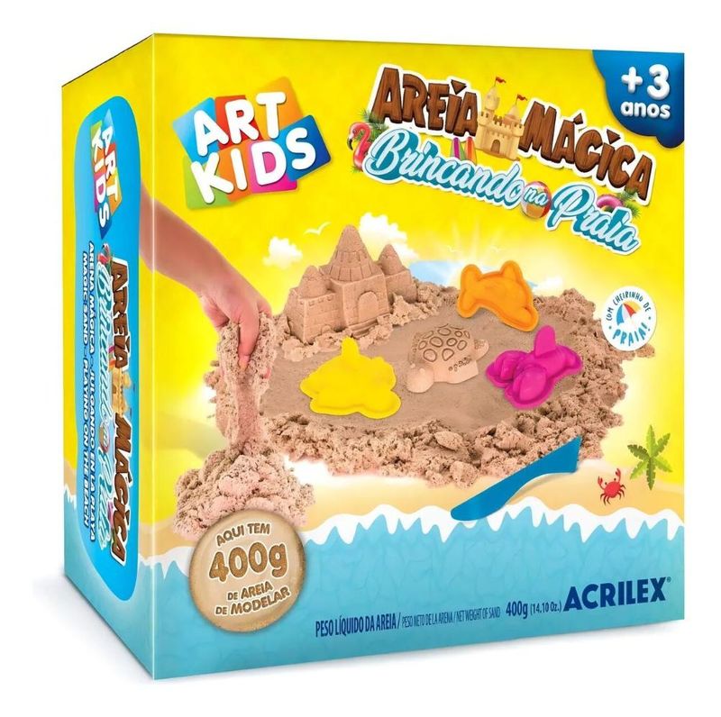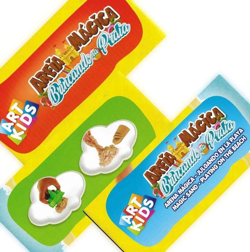 Kit com 2 Potes de Areia Mágica (200g cada) 4 moldes e 1 acessório. Além da diversão, a Areia Mágica promove uma incrível experiência sensorial, desenvolve a coordenação motora, habilidades manuais e a criatividade. A criança pode modelar, fazer esculturas, cortar, juntar, esticar e soltar a imaginação. Não molhar e não brincar com sua Areia Mágica com as mãos úmidas ou molhadas para evitar manchamentos. Usar somente sobre superfícies limpas. Para manter o aspecto do produto por mais tempo, armazene-o adequadamente dentro do pote bem tampado. Não Tóxico, Composição: Areia, Resina, Aditivos e Pigmentos (exceto cor natural) Composição dos moldes: Resina Termoplástica. As cores podem variar das apresentadas na embalagem. Aviso legal • Idade mínima recomendada 3 anos.