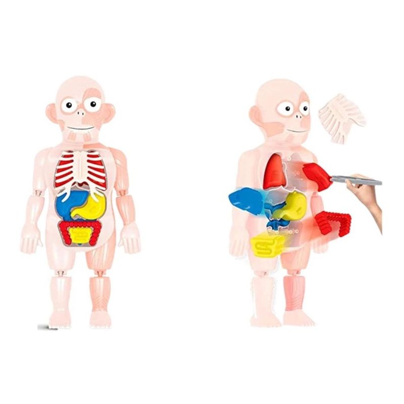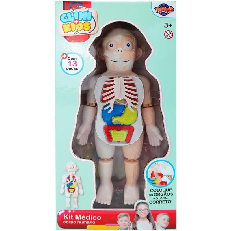 Acompanha pinça, 1 modelo de corpo humano, 02 pernas, 02 braços, 12 órgãos de brinquedo. Seu filho vai adorar brincar de médico, além de aprender o lugar de cada órgão.