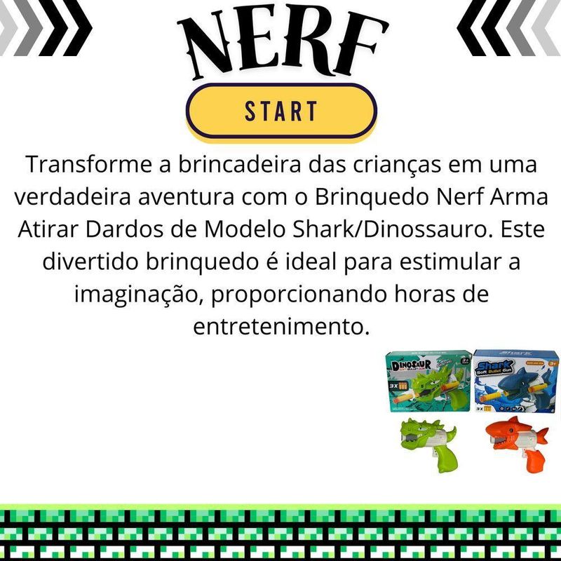 Brinquedo Lançador De Do Tipo Nerf Tubarão Dinossauro Com 3 Cor:laranjaTransforme a brincadeira das crianças em uma verdadeira aventura com o Brinquedo Nerf Arma Atirar de Modelo Shark/Dinossauro. Este diido brinquedo é ideal para estimular a imaginação, proporcionando horas de entretenimento.Características:Design Temático: Disponível nos modelos inspirados em tubarão e dinossauro, essa Nerf possui um visual chamativo que encanta os pequenos fãs de çamento de : Acompanha 3 feitos de plástico com ponta emborrachada, garantindo a durante as brincadeiras.Tamanho Compacto: Com aproximadamente 14 cm de comprimento, é fácil de manusear e transportar, ideal para crianças a partir de 4 anos.Benefícios:Estímulo à Criatividade: Permite que as crianças criem suas próprias histórias e aventuras, desenvolvendo habilidades cognitivas e sociais.Brincadeira Segura: Os são projetados para serem leves e seguros, proporcionando tranquilidade para os pais.Interatividade: Ótimo para brincadeiras em grupo, incentivando a cooperação e a competição saudável entre amigos.Especificações:Conteúdo da Caixa: 1 Nerf Modelo Shark/Dinossauro, 3 de plástico/ões do Brinquedo: 14 cm de Recomendada: A partir de 4 anos.Leve a diversão para o próximo nível com o Brinquedo Nerf Arma Atirar de Modelo Shark/Dinossauro. Um presente perfeito para crianças que adoram ação e aventura, garantindo entretenimento sem fim!Item Incluso:1-Brinquedo Nerf Arma Atirar de Modelo Shark/Dinossauro.
