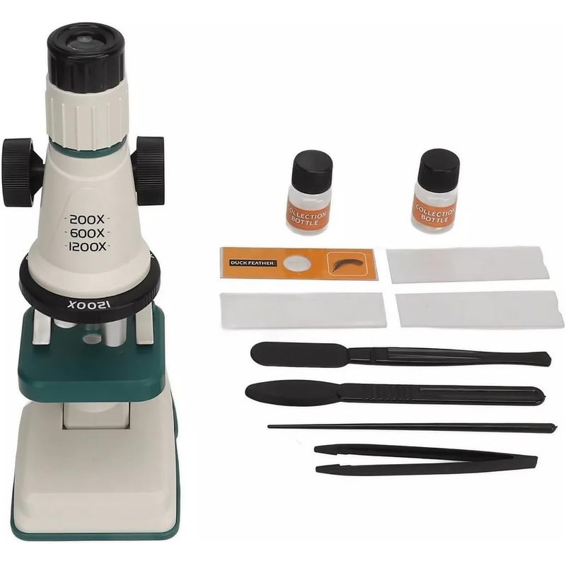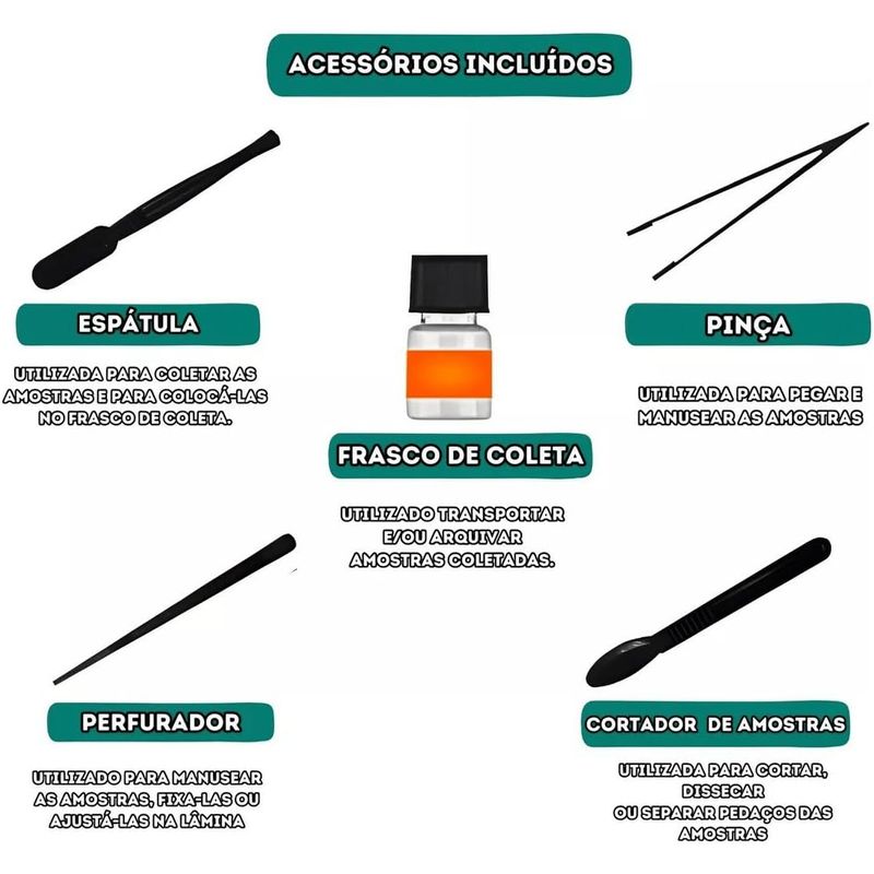 :: Conteúdo da embalagem: 01 Microscópio; 01 Espátula; 01 Pinça; 01 Perfurador; 01 Cortador de Amostras; 01 Lâmina com Amostra de Pena de Pato; 02 Frascos de Coleta; 03 Lâminas de Vidro
