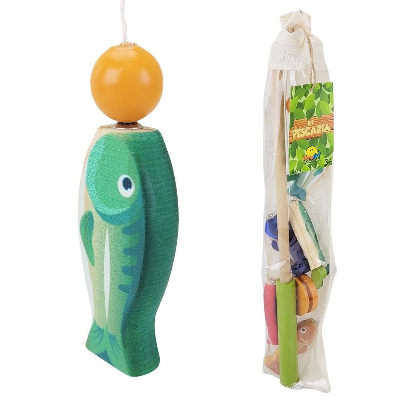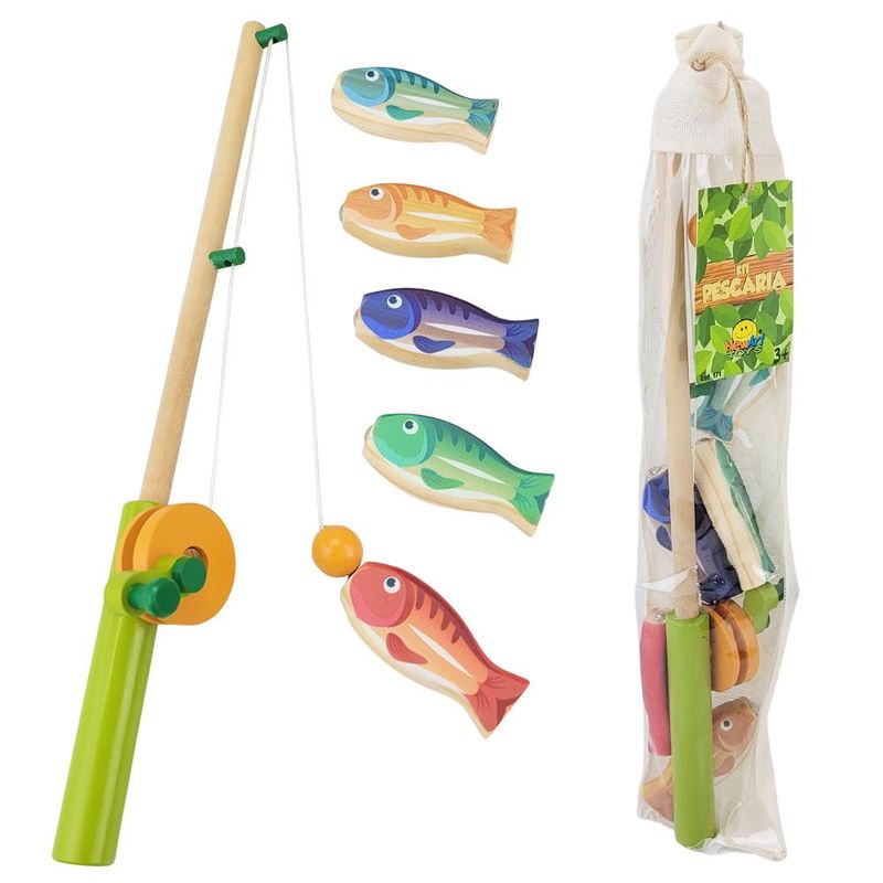 Este kit de pescaria infantil tem como principal objetivo, segurar a vara de pescaria e pescar os peixinhos pela boca. Tanto a vara quanto os peixinhos de madeira, possuem imã nas pontas que se unem ao contato. Feito todo em madeira, este brinquedo de pescaria trabalha a atenção, estímulo, coordenação motora, concentração e discriminação visual.