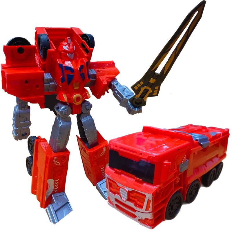 Modos de Transformação: O brinquedo possui duas formas: um robô mecha e um caminhão vermelho, similar ao Optimus Prime.