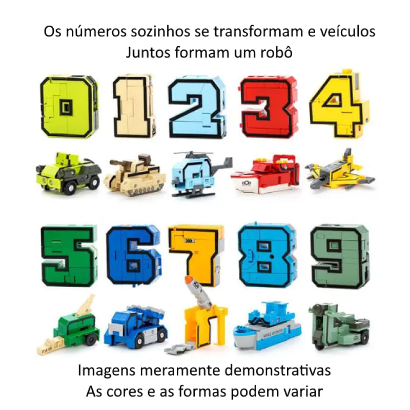 Brinquedo Didático Educativo Números Transformers que se transformam em 3 Modelos de Robôs ou 10 Veículos