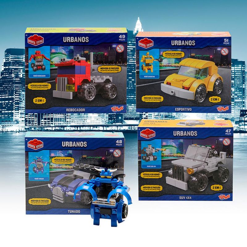Você já imaginou um brinquedo que une a emoção de montar algo incrível com o entusiasmo de vê-lo ganhar vida? Com o brinquedo Urbanos, seu filho pode ser o criador de um veículo ou robô. São 51 peças que desafiam a criatividade e a imaginação, e o melhor: uma vez montado, ele se movimenta, trazendo um novo nível de interação. Desenvolvimento da coordenação motora fina: A montagem do brinquedo ajuda a criança a desenvolver habilidades manuais enquanto encaixa as peças. Estímulo ao pensamento lógico: Ao construir um robô ou veículo, seu filho aprende sobre organização, solução de problemas e como as partes se conectam para formar um todo funcional. Engajamento e paciência: A construção exige atenção e paciência, incentivando a criança a trabalhar de forma independente ou em grupo para alcançar o resultado final. Conceitos de física básica: Ao ver o brinquedo movido à fricção em ação, as crianças começam a entender, de forma simples, princípios de movimento e energia. As peças são feitas de ABS, um plástico altamente resistente e seguro, que garante que o brinquedo seja durável mesmo após várias montagens e brincadeiras. Material: ABS INMETRO: 002000/2024 Indicação: + 4 anos de idade Composição: 51 peças