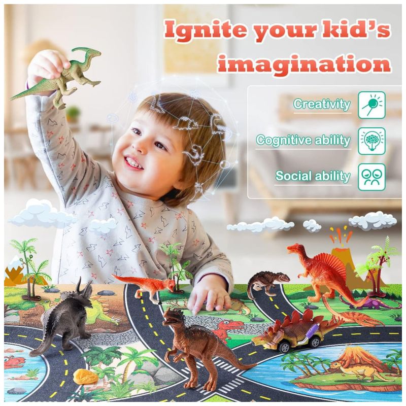 Os brinquedos de dinossauros são uma das melhores opções para crianças de 2 a 5 anos, pois despertam horas de criatividade enquanto as crianças brincam com criaturas lendárias O conjunto também inclui carros retráteis de dinossauros que podem percorrer longas distâncias sem necessidade de bateria, tornando os ainda mais emocionantes para as crianças. O tapete de dinossauro tem um tamanho grande o suficiente para 24 crianças desfrutarem de seu Jurassic World, permitindo que elas compartilhem suas ideias de imaginação sobre dinossauros com amigos e familiares.