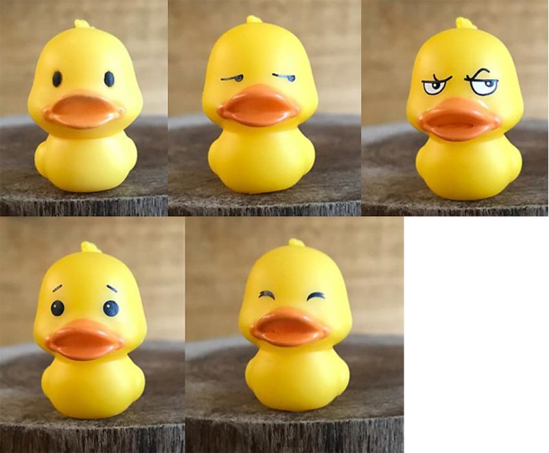 O set acompanha 5 patos de 4cm, cada um com uma expressão diferente e a caxinha da última foto (a cor do papel pode variar)
