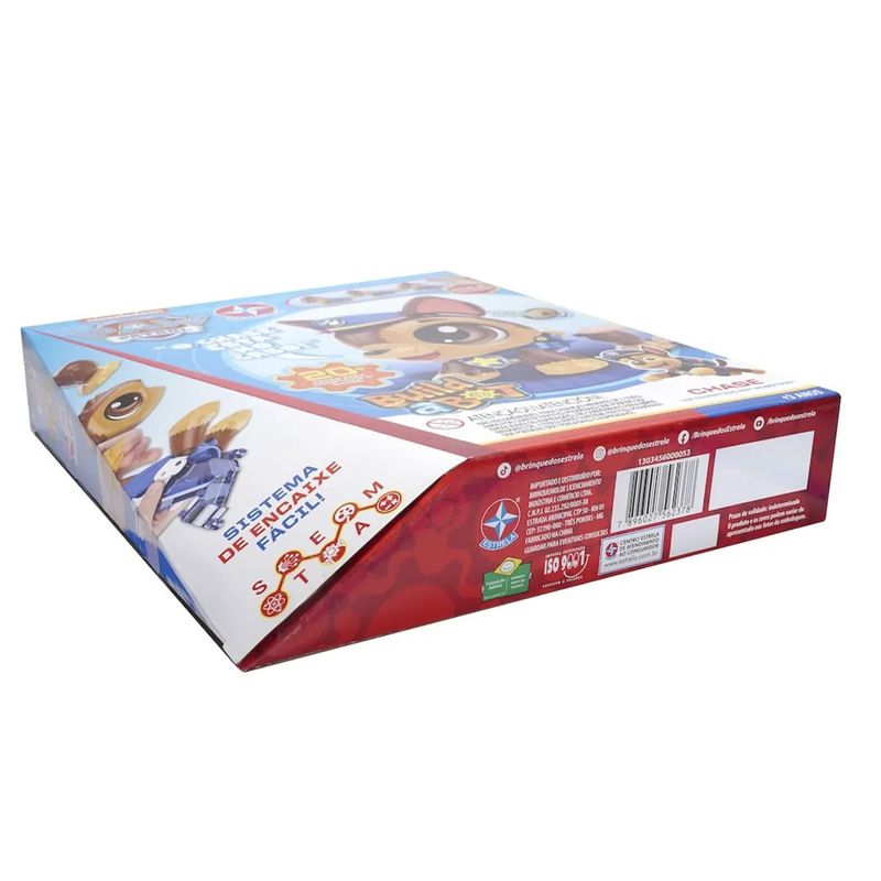 Crie seu próprio Robô da Patrulha Canina! Com muita diversão trazemos a patrulha canina! Brinque com o Chase um dos principais personagens do desenho. Junte as peças e cole os adesivos para construir o robô Chase. O cachorro vem desmontado em cerca de 20 peças plásticas e com eletrônica, sendo parte da importante da brincadeira montar o seu amigo robô. Adicione 2 pilhas AA (não incluídas) e interaja com o robô.Quando montado, ele obedece movimentos acionados por palmas ou por toques no rabinho, falando frases icônicas de seu personagem e pulando!Para acionar seu Build a Bot bata palmas ou de toques no rabinho dele e veja ele se movimentando sozinho e falando frases da série Patrulha Canina! Agora você e seu Build a Bot estão prontos para salvar o dia!O brinquedo também é customizavel, vindo com uma cartela de adesivos para a criança decorar como quiser.Peças: