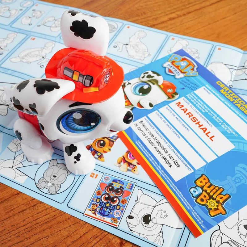 Crie seu próprio Robô da Patrulha Canina! Com muita diversão trazemos a patrulha canina! Brinque com o Marshall um dos principais personagens do desenho. Junte as peças e cole os adesivos para construir o robô Marshall.O cachorro vem desmontado em cerca de 20 peças plásticas e com eletrônica, sendo parte da importante da brincadeira montar o seu amigo robô. Adicione 2 pilhas AA (não incluídas) e interaja com o robô.Quando montado, ele obedece movimentos acionados por palmas ou por toques no rabinho, falando frases icônicas de seu personagem e pulando!Para acionar seu Build a Bot bata palmas ou de toques no rabinho dele e veja ele se movimentando sozinho e falando frases da série Patrulha Canina! Agora você e seu Build a Bot estão prontos para salvar o dia!O brinquedo também é customizavel, vindo com uma cartela de adesivos para a criança decorar como quiser.Peças: