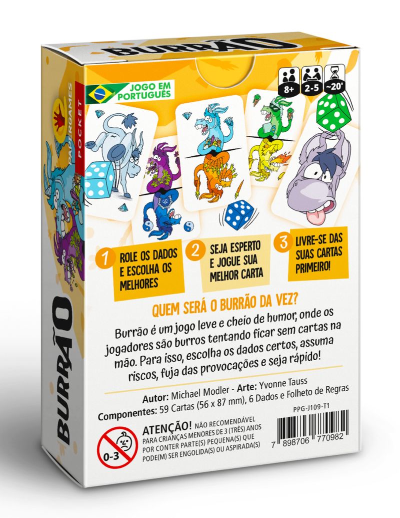 Burrão é um jogo leve e cheio de humor, onde os jogadores são burros tentando ficar sem cartas na mão. Para isso, escolha os dados certos, assuma riscos, fuja das provocações e seja rápido!