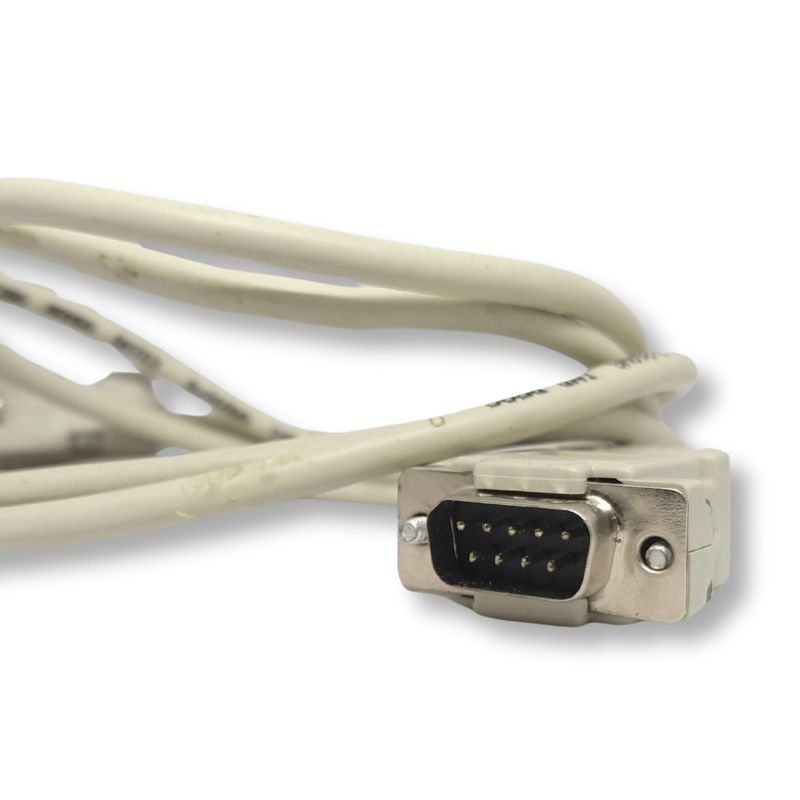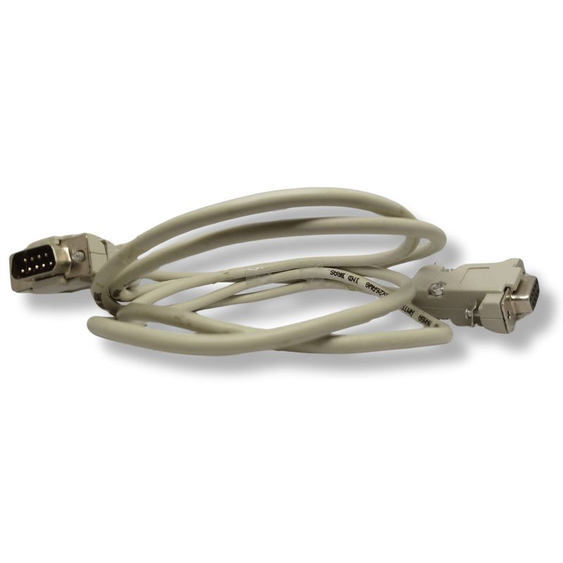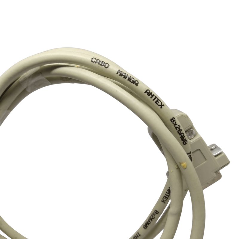 Cabo serial DB9 macho x DB9 fêmea montado com cabo manga Antex 8x26AWG, ideal para comunicação RS232 entre dispositivos como leitores de código de barras, balanças, impressoras fiscais e equipamentos industriais.