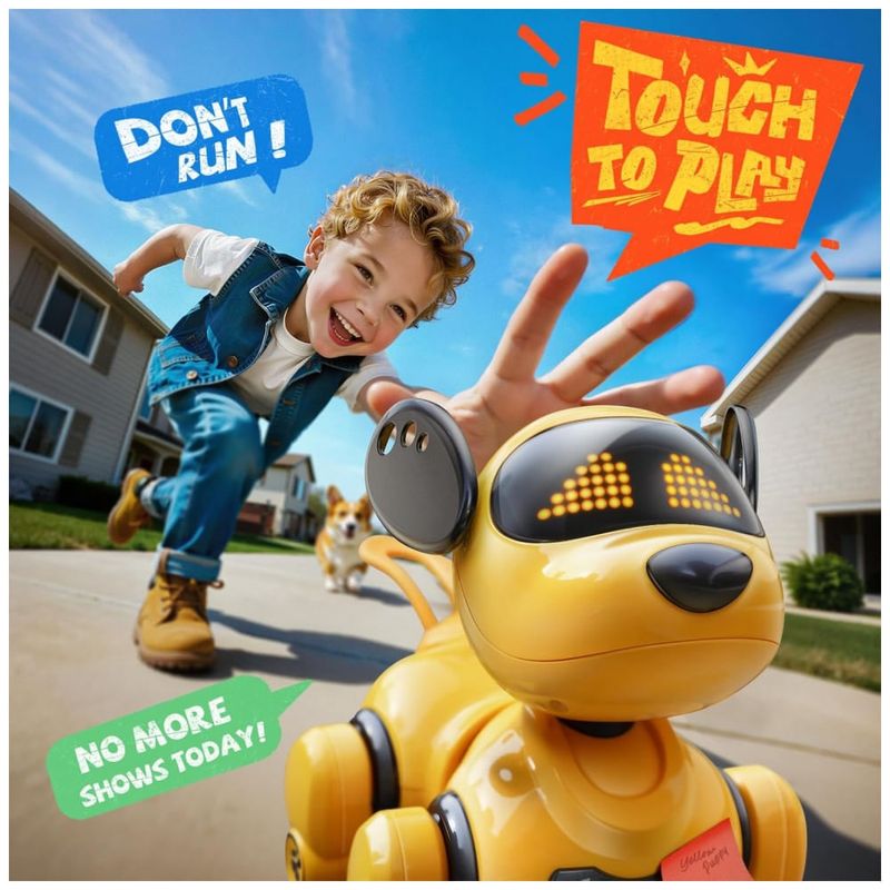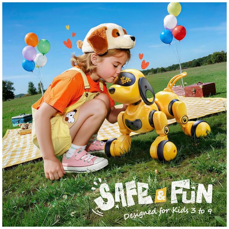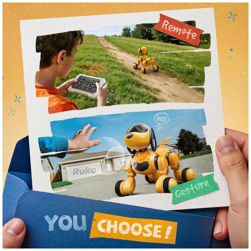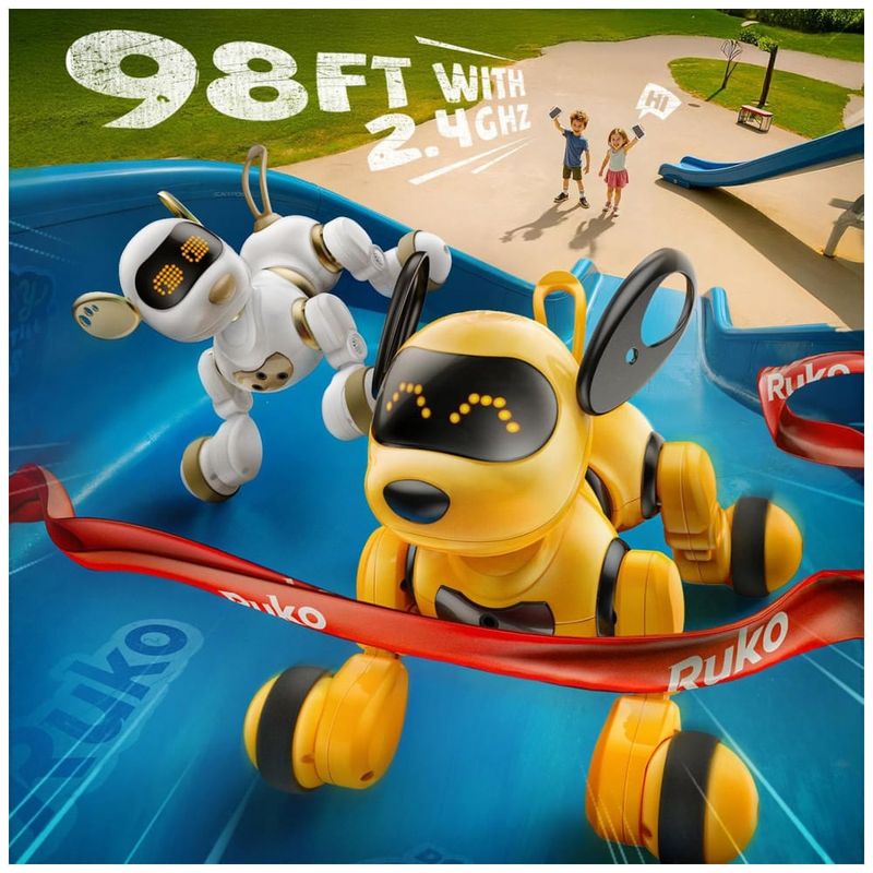 O cachorro robô inteligente Ruko 18011 amarelo é um brinquedo eletrônico interativo indicado para crianças a partir de 3 anos, com corpo em plástico ABS e acabamento liso, projetado para caminhar e deslizar em superfícies planas. Ele realiza movimentos como corrida, giros, deslizar, abanar o rabo, simular latidos e outras ações cômicas, com controle por gestos ou controle remoto sem fio, permitindo que a criança o direcione a distância em ambientes internos.