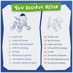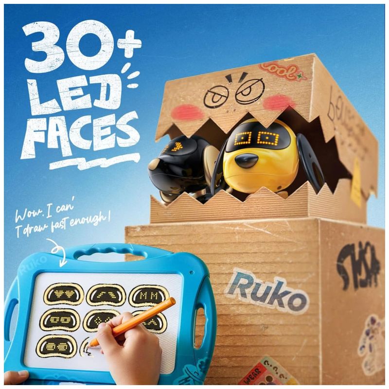 O robô conta com painel facial em LED composto por cerca de 70 pontos luminosos, capaz de exibir mais de 30 expressões diferentes para simular emoções em tempo real. O modo de programação permite encadear até 50 movimentos (como latir, dançar, virar e deslizar) em sequência, incentivando a exploração de lógica básica e criação de rotinas personalizadas. Sensores frontais de obstáculos ajudam o robô a desviar de móveis e paredes, reduzindo colisões durante o uso. A bateria recarregável interna fornece até 45 minutos de uso após aproximadamente 3 horas de recarga via cabo USB A–C incluso, enquanto o controle remoto utiliza 2 pilhas AAA 1,5V.