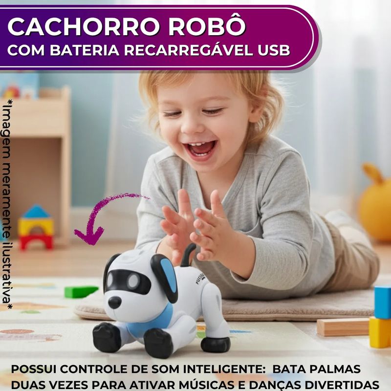 - Estimula coordenação, criatividade e interesse por ciência e tecnologia. Kit Completo: 1 Cachorro Robô, 1 Controle remoto sem fio, 1 Cabo USB para carregamento e 1 Manual Especificações: - Material: Plástico ABS de alta durabilidade;