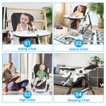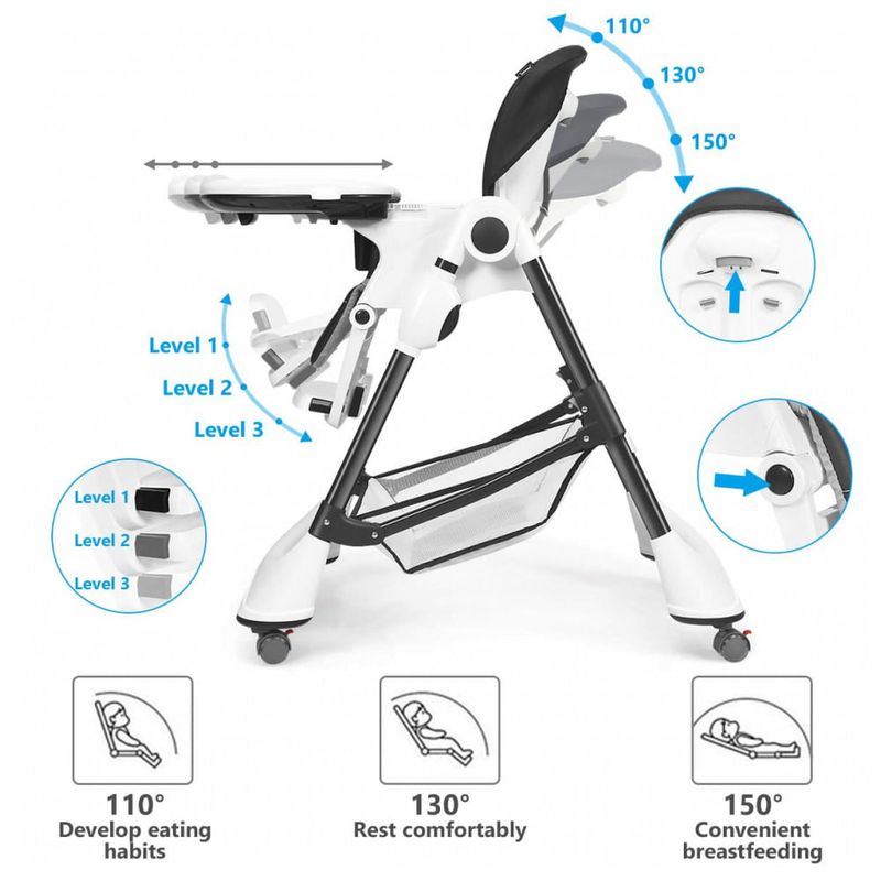 AJUSTE MULTIFUNCIONAL A cadeira alta para bebês pode atender a todas as suas necessidades. A altura do assento é ajustável com 7 posições para corresponder a diferentes alturas das mesas. O encosto de 3 posições oferece o espaço mais confortável com o crescimento do seu bebê. O apoio para os pés de 3 posições para atender às diferentes posturas do bebê. O comprimento do apoio para os pés tem 3 níveis para obter a posição mais confortável para as pernas do bebê. As bandejas de 3 posições para bebês de diferentes idades para comer ou brincar de recém nascido a criança.