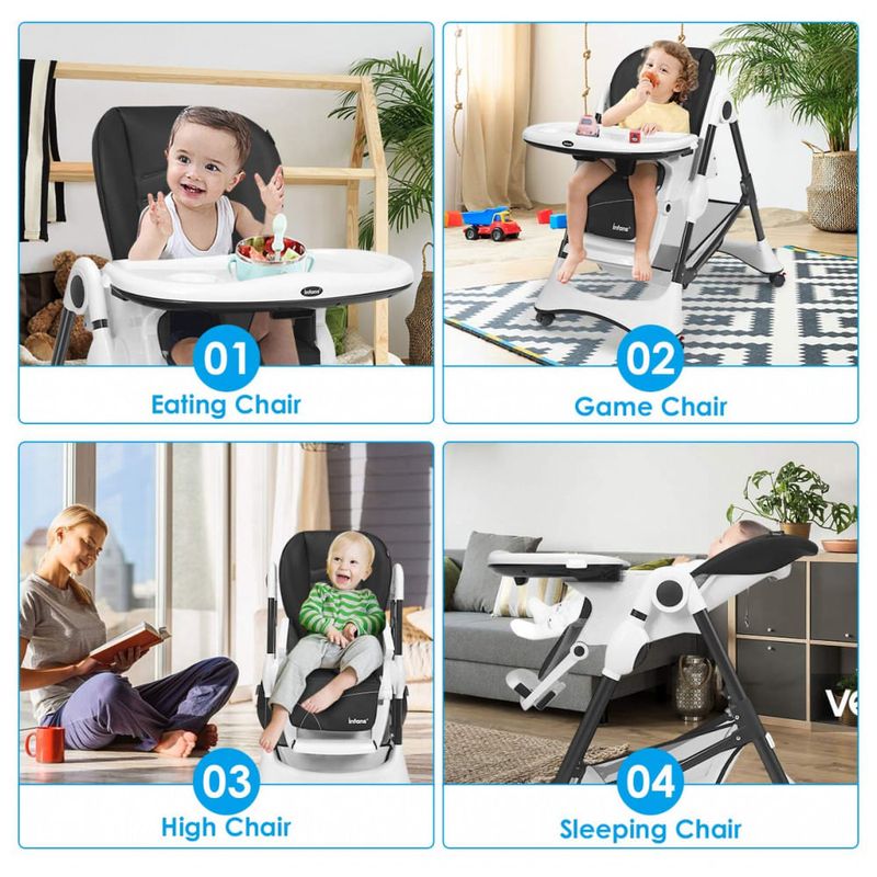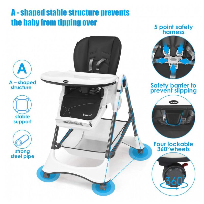 CONVENIENTE DE LIMPAR Você sempre tem problemas com a limpeza A cadeira alta INFANS ajudou as mães a resolver este problema. A cadeira contém bandejas duplas destacáveis. A bandeja superior pode ser lavada na lava louças e pode ser usada para alimentar ou comer bebês. A bandeja inferior é a área de recreação onde os bebês podem se divertir brincando. A capa de almofada de PU removível e impermeável é fácil de limpar e evita o acúmulo de poeira