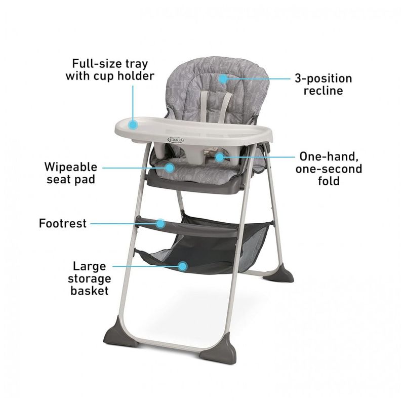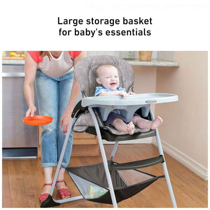 A grande cesta de zenamento mantém os itens essenciais do bebê por perto durante as refeições