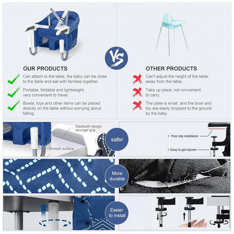 Fácil de instalar e limpar Este gancho na cadeira leva apenas 20 segundos para instalar e desmontar, a dobra compacta cabe facilmente em bolsas de zenamento, carrinhos de bebê. A capa de algodão pode ser removível para limpeza fácil de lavar à mão ou na máquina.
