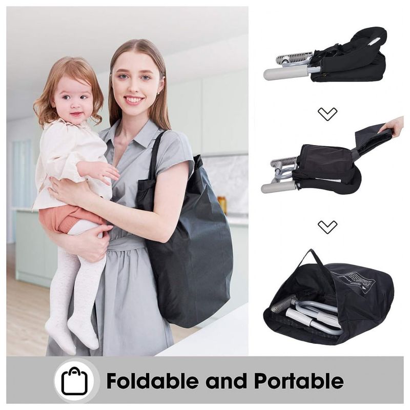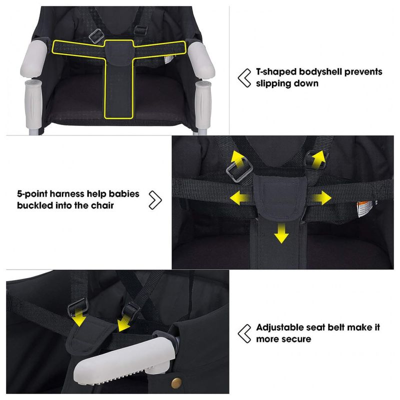 DETALHE DE SEGURANÇA O gancho portátil na cadeira pode segurar o bebê com pelo menos 6 meses de idade ou até 16 kg. Um arnês de segurança de 5 pontos pode evitar que o bebê fique de pé mesmo com o arnês travado, garante que seu bebê fique exatamente onde ele pertence.