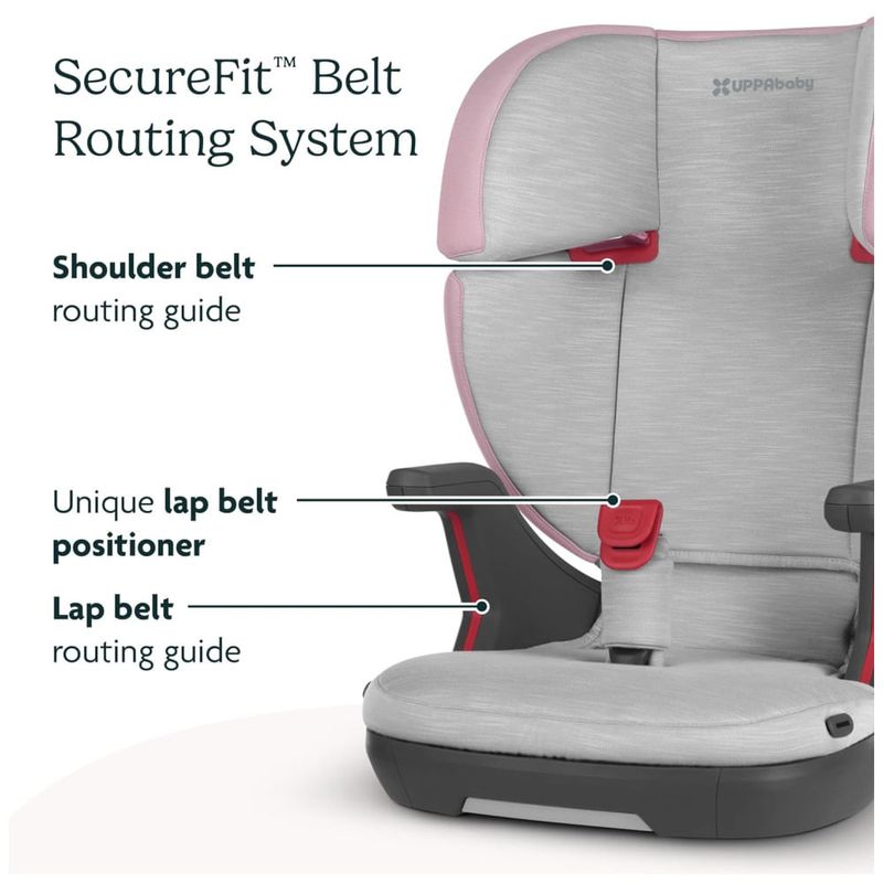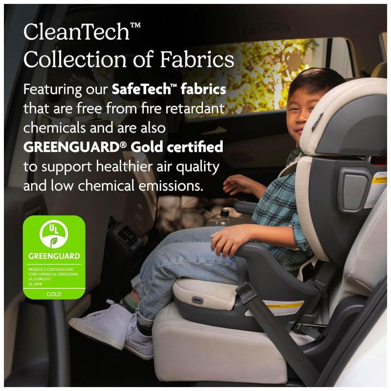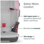 Para segurança, possui pods de proteção contra impactos laterais que absorvem e dispersam as forças em caso de colisão. Os posicionadores de cinto de segurança permitem que a criança ajuste o cinto de forma segura por conta própria. O encosto do assento é construído com espuma EPP e espuma de memória para mitigar as forças de impacto.